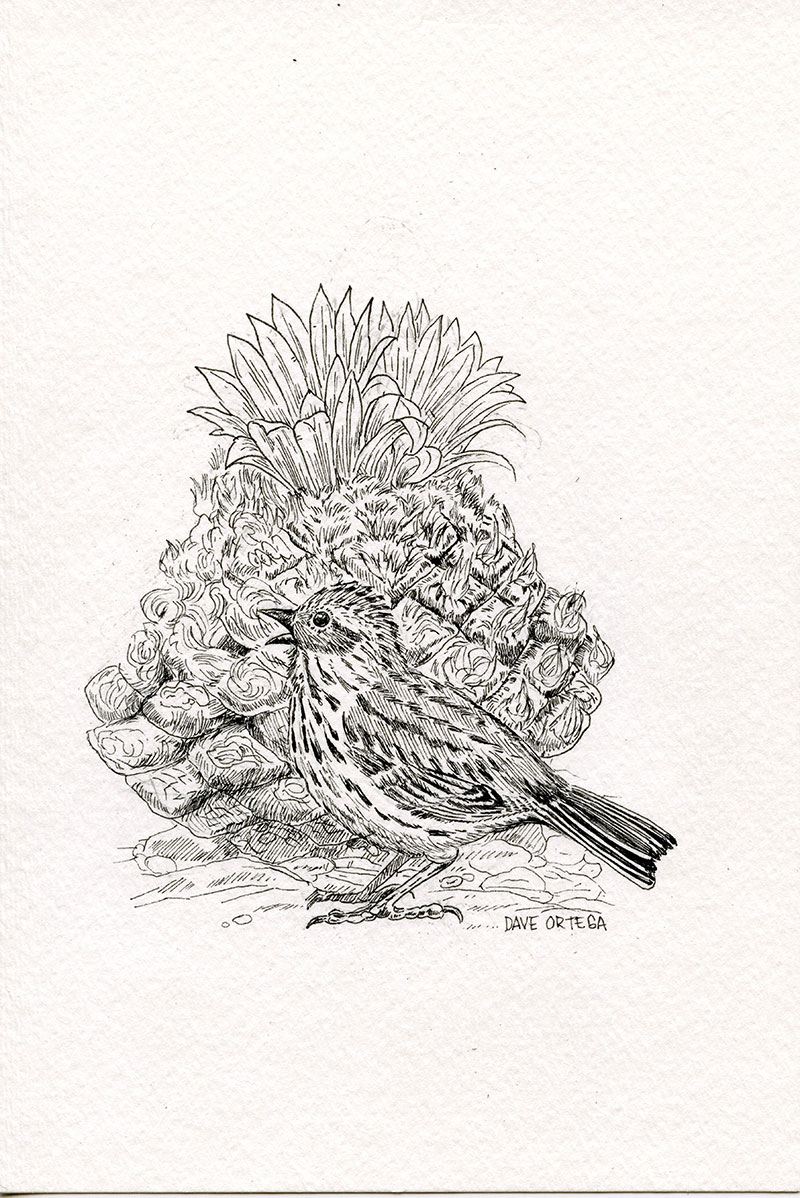 Original drawing from my East meets Southwest series that presents birds from outside desert regions with desert flora. A vesper sparrow chirps in front of a living rock cactus. A great gift for a nature lover or to accompany your plant or reading nook.