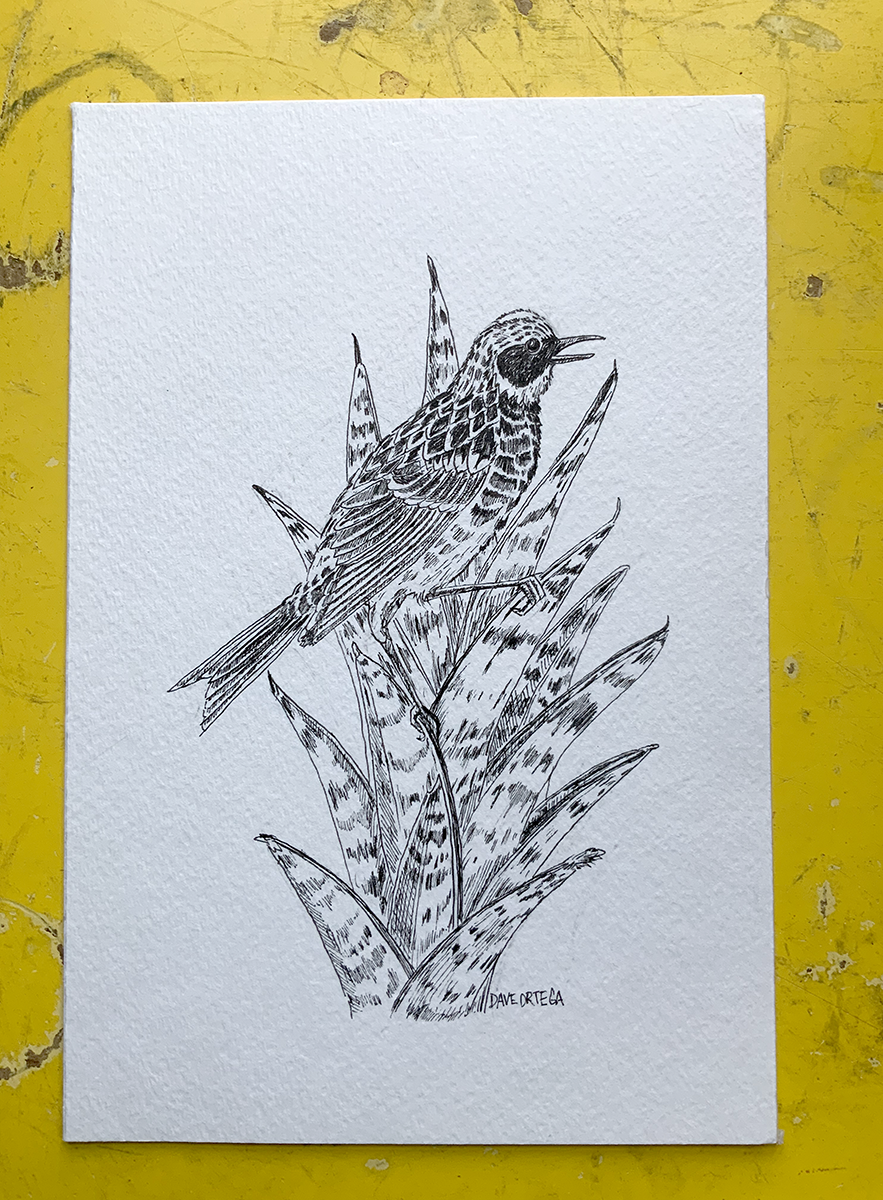 Original drawing from my East meets Southwest series that presents birds from outside desert regions with desert flora. A myrtle warbler improbably perches on a succulent. A great gift for a nature lover or to accompany your plant or reading nook.